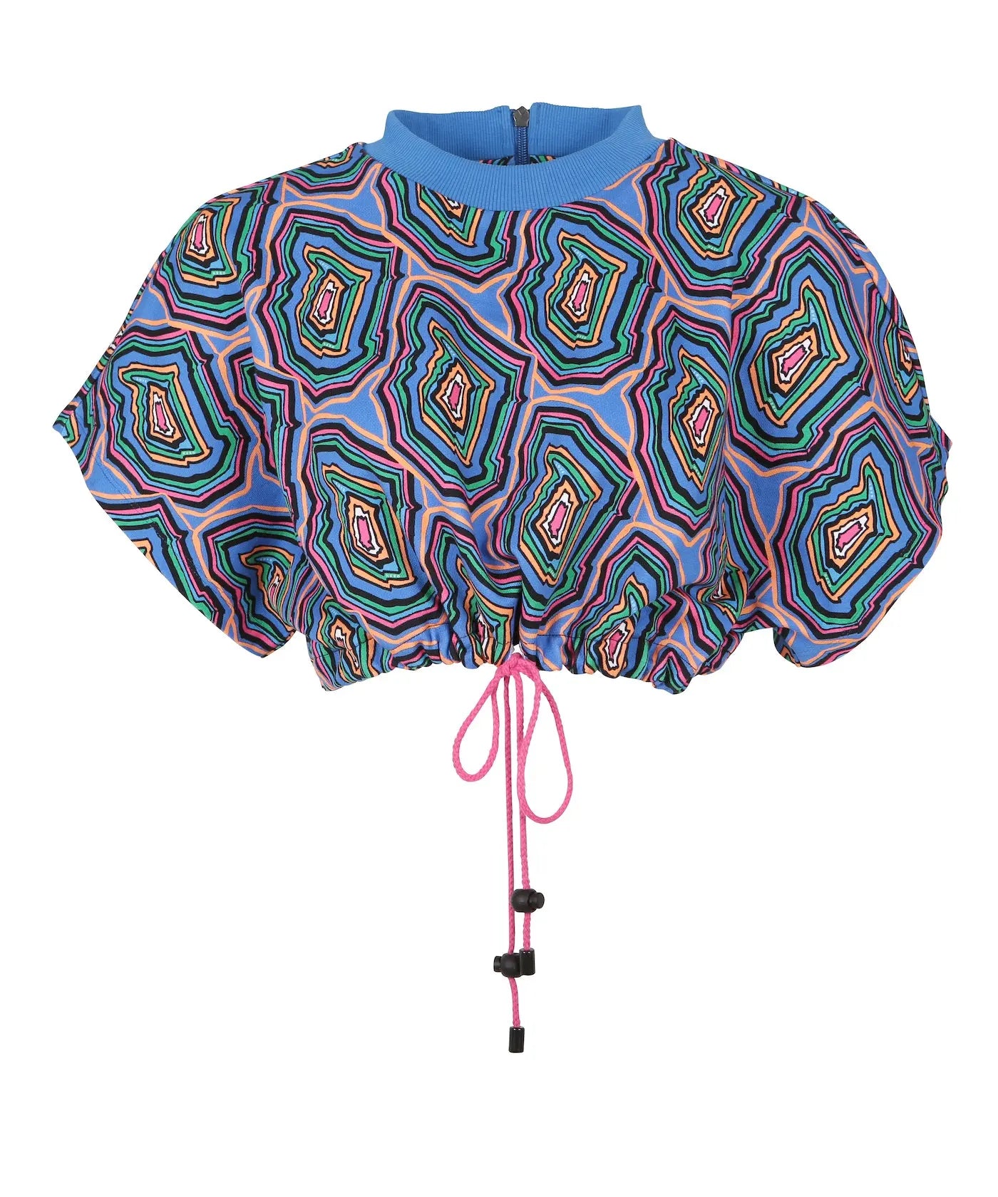 This Crop Top can be drawn in with an elastic draw cord with toggle, a flattering dolma sleeve and a semi-high crew neck is finished with zip at the back of the neck.