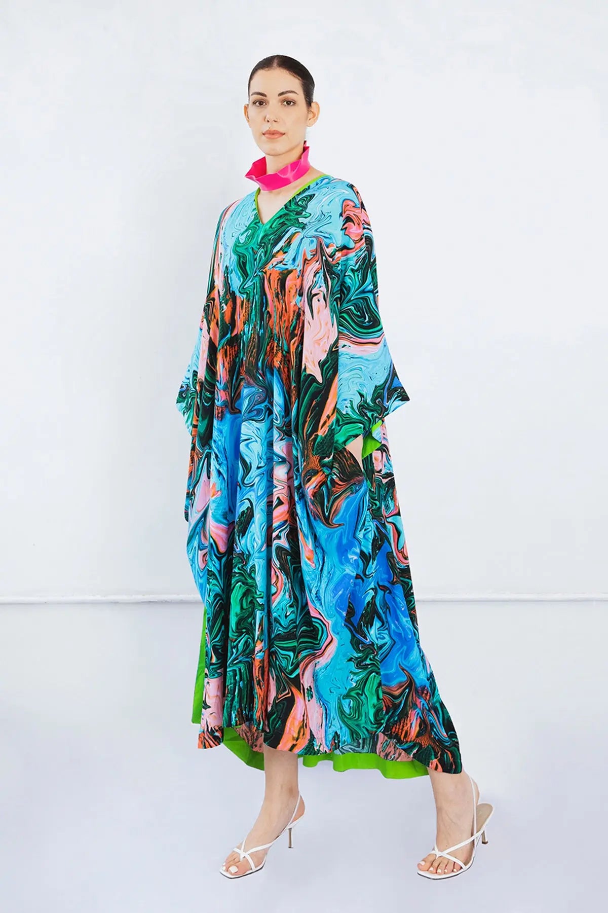 A stunning Printed Kaftan from our Second Layer Collection! Focusing on our core values, this piece is sustainable as it is stylish. The best seller from our previous collection has been slightly slimmed, but still has a lot of volume! The multicoloured paint strokes are inspired by artistic notions of layering paint over an existing painting on a canvas.