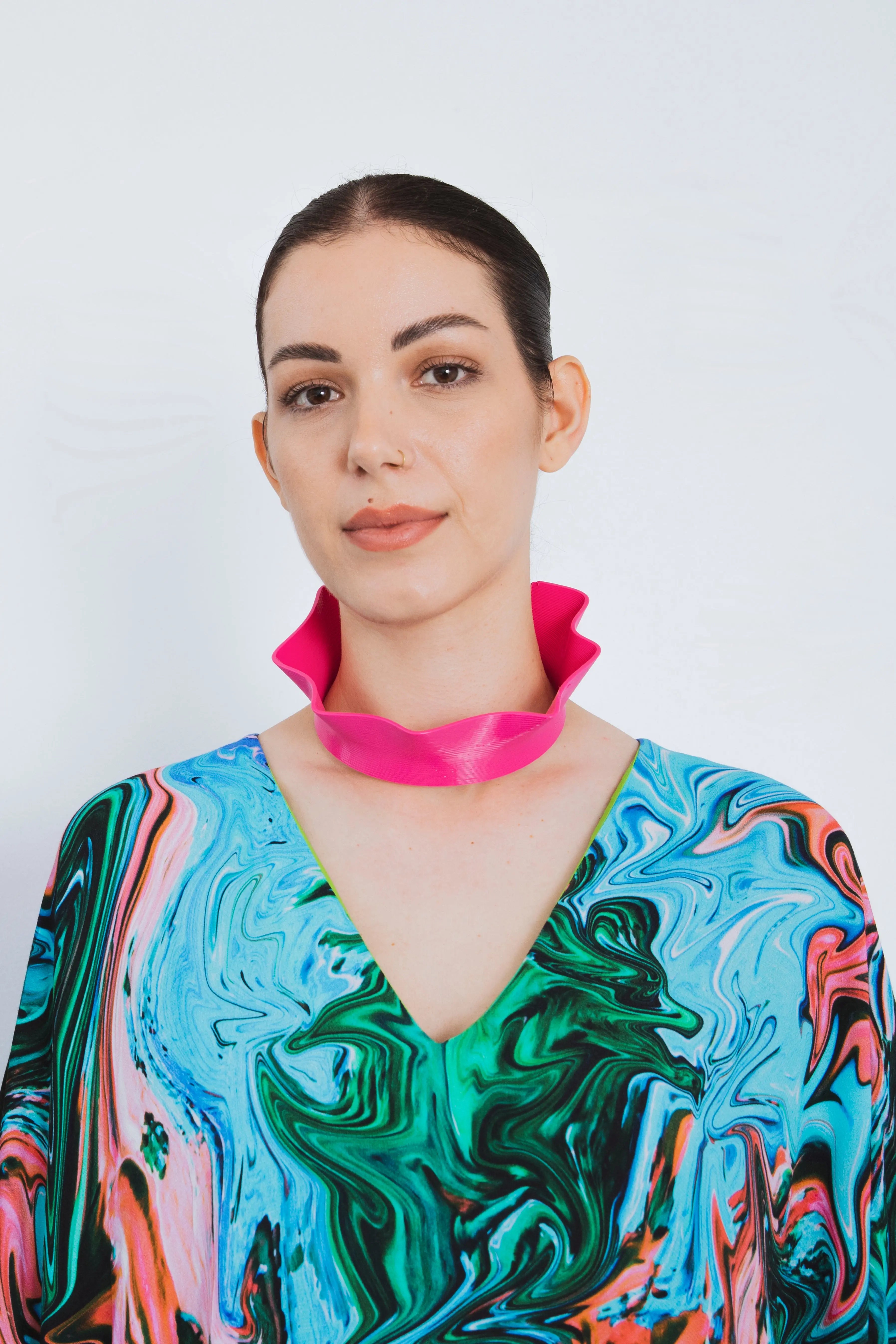 The kaftan comes in ONE SIZE. You can style it in more than one way as the garment is extremely versatile and fashionable. You can wear it with a belt for a snatched look or wear it by itself for a straighter silhouette. Style with our 3D printed jewellery for added impact.