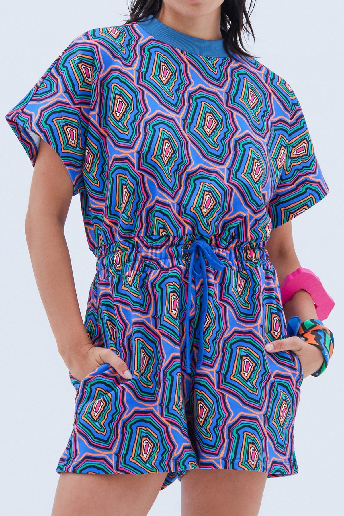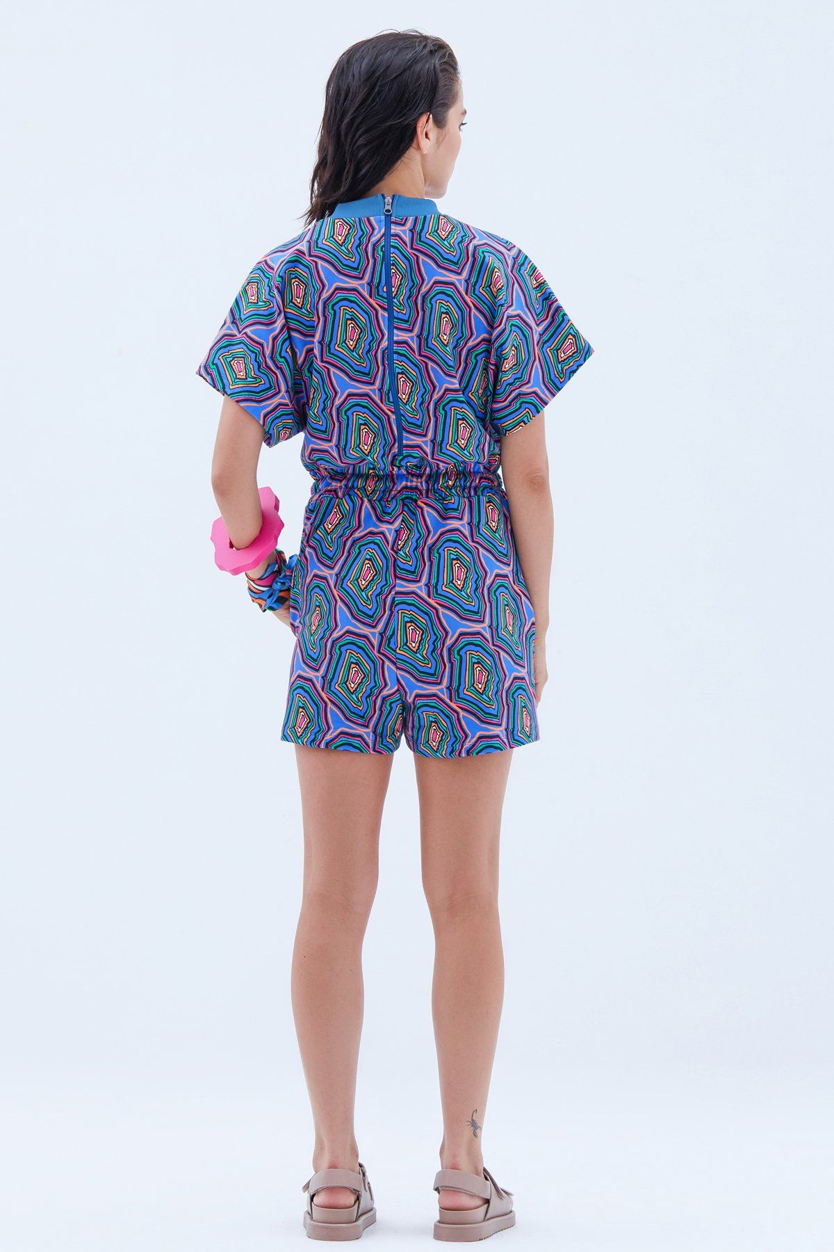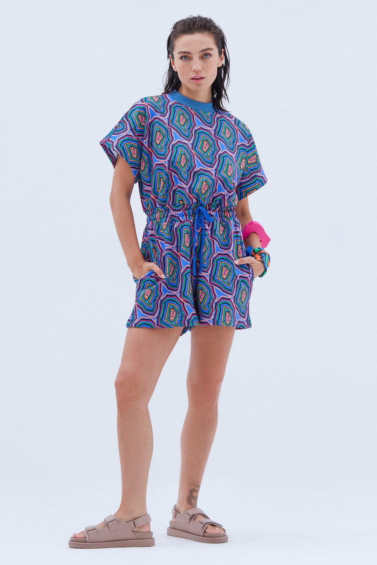 Short Playsuit with Drawstring Tie in Concentric Blue