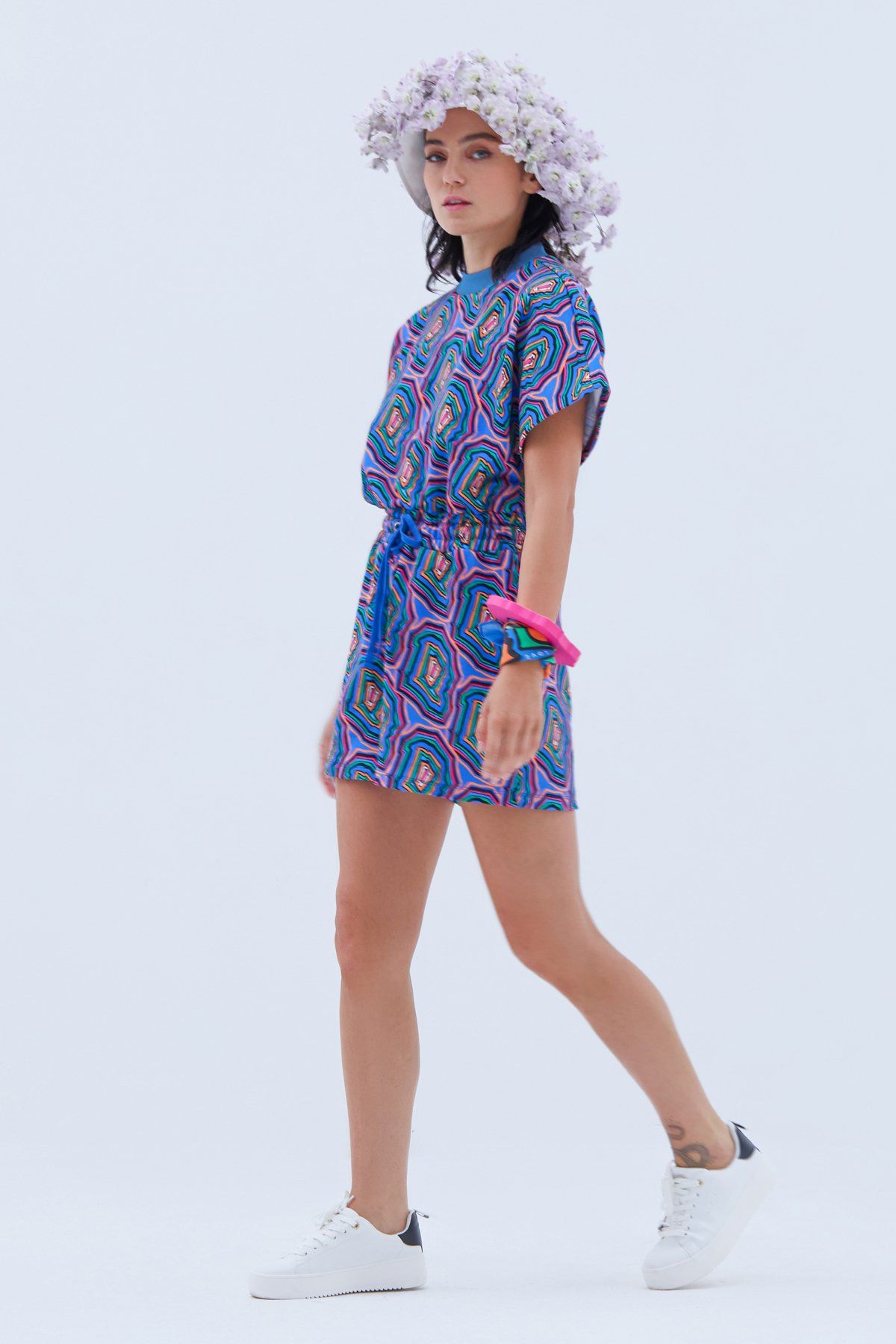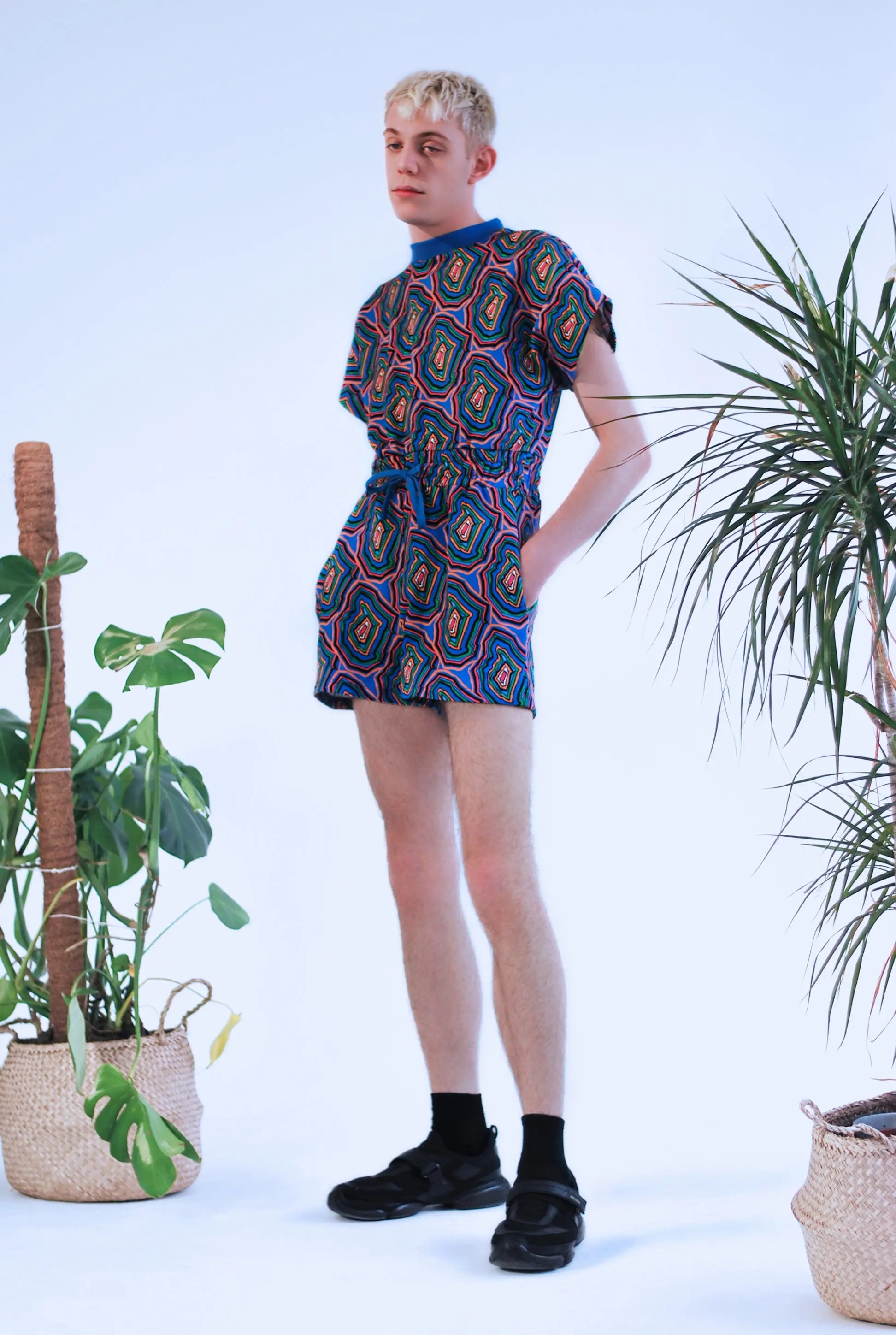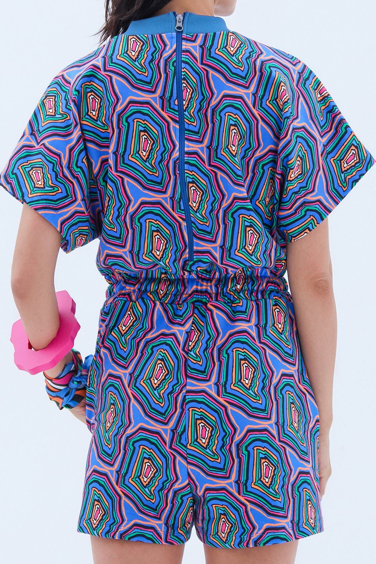 Short Playsuit with Drawstring Tie in Concentric Blue